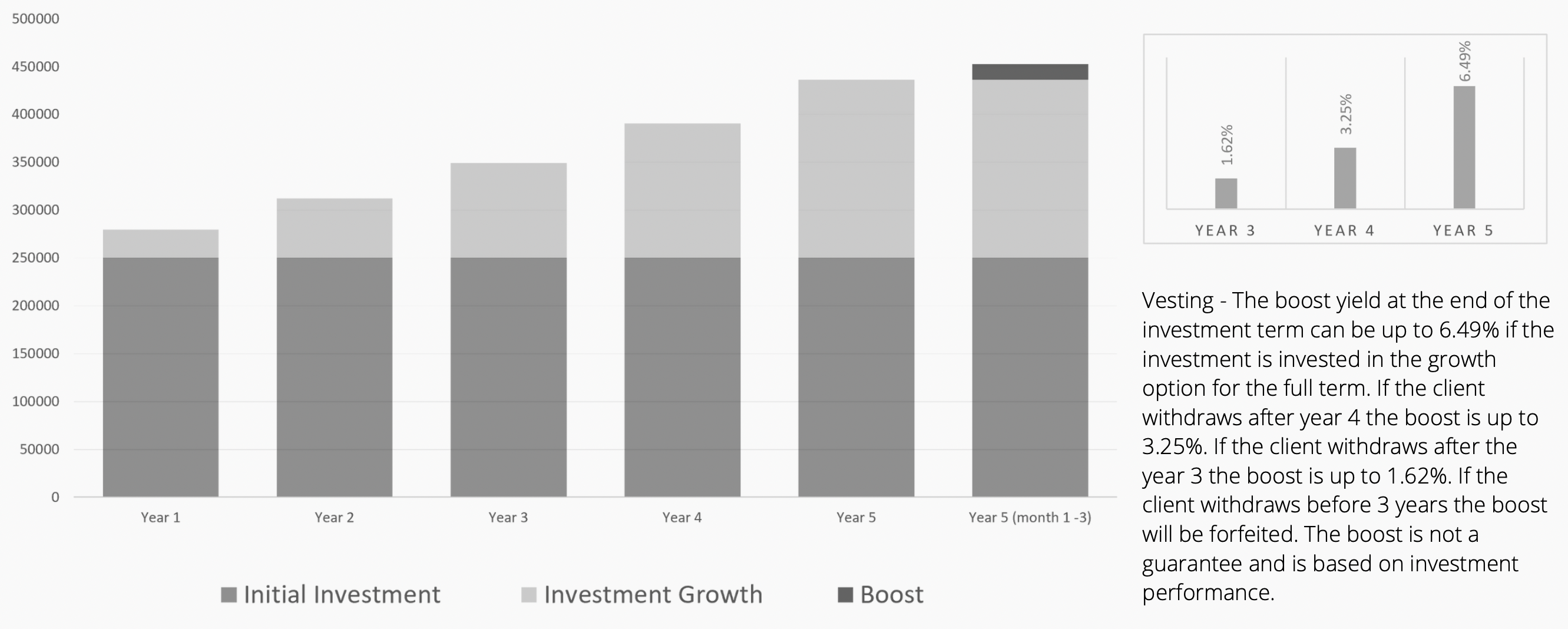 Vesting - The boost yield at the end of the investment term can be up to 6.49% if the investment is invested in the growth option for the full term. If the client withdraws after year 4 the boost is up to 3.25%. If the client withdraws after the year 3 the boost is up to 1.62%. If the client withdraws before 3 years the boost will be forfeited. The boost is not a guarantee and is based on investment performance.